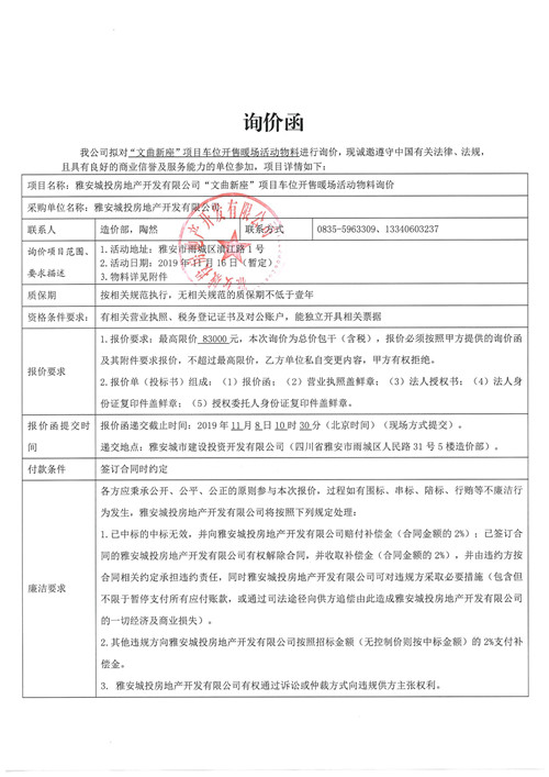 雅安城投房地產開發(fā)有限公司“文曲新座”項目車位開售暖場活動物料詢價函(第二次)