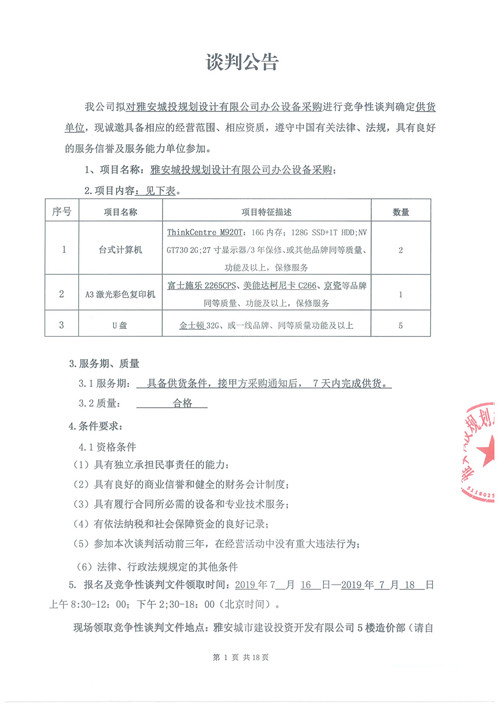 雅安城投規(guī)劃設(shè)計有限公司辦公設(shè)備采購競爭性談判公告