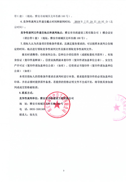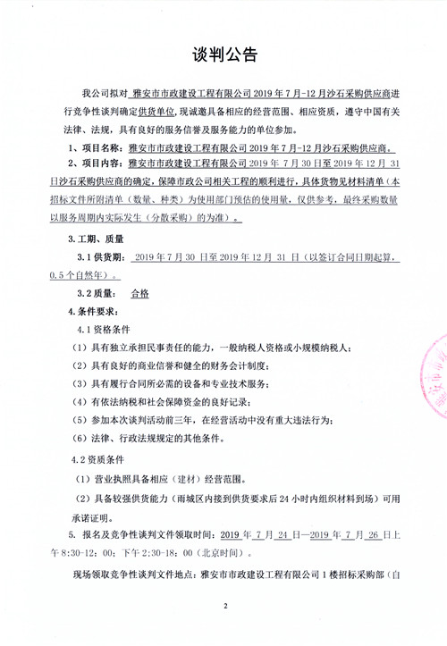 市政公司2019年7月-12月沙石采購供應商競爭性談判公告