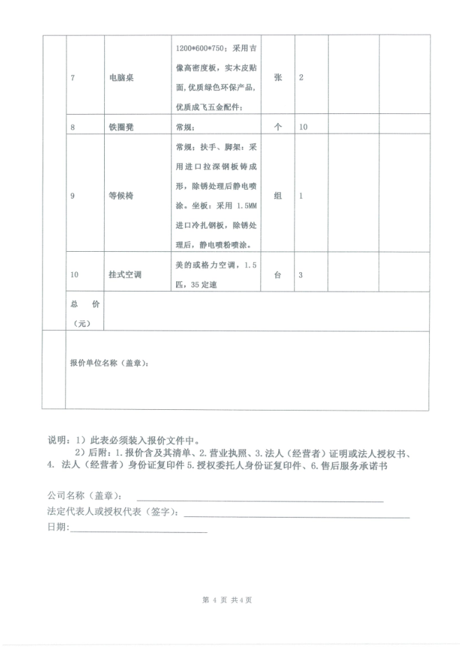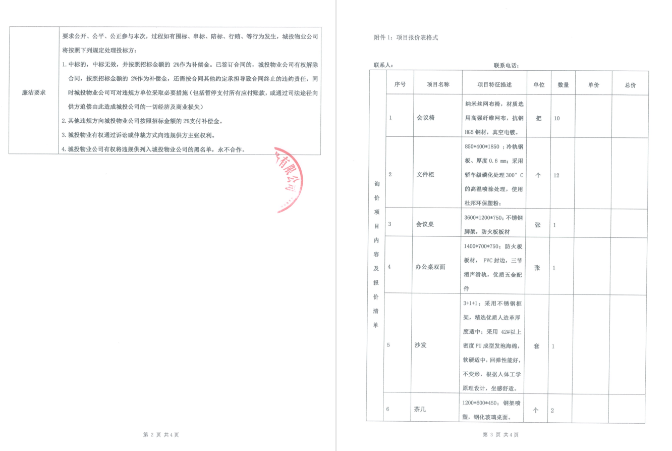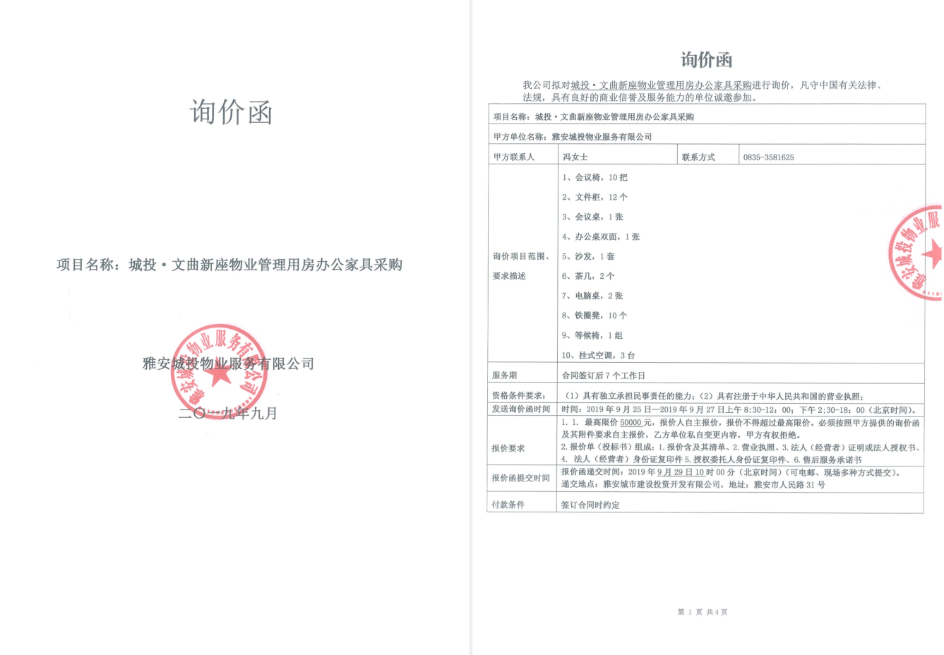 城投·文曲新座物業(yè)管理用房辦公家具采購(gòu)詢(xún)價(jià)函
