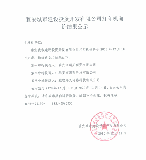 雅安城市建設(shè)投資開發(fā)有限公司打印機(jī)詢價(jià)結(jié)果公示