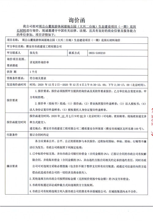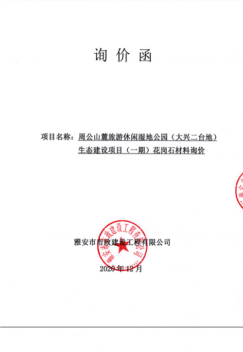 市政公司 周公山麓旅游休閑濕地公園(大興二臺地)生態(tài)建設(shè)項目(一期)花崗石材料詢價函
