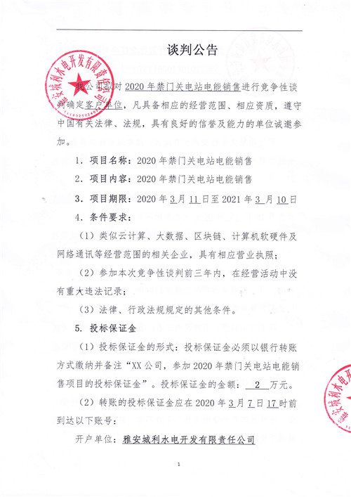 2020年禁門關(guān)電站電能銷售競(jìng)爭(zhēng)性談判公告