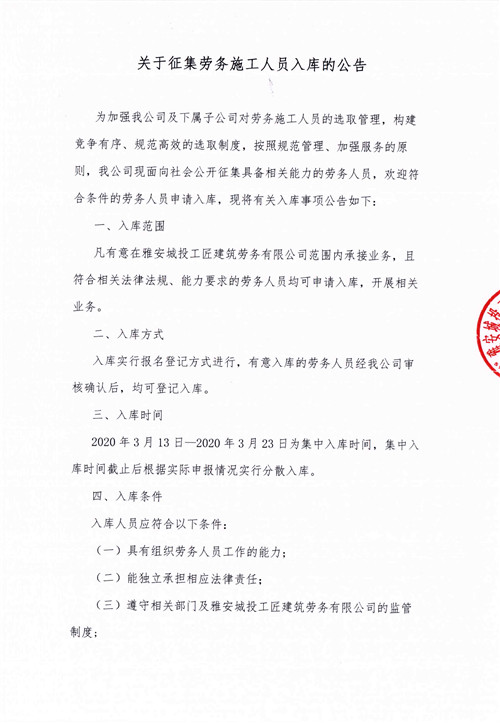 關(guān)于征集勞務(wù)施工人員入庫(kù)的公告