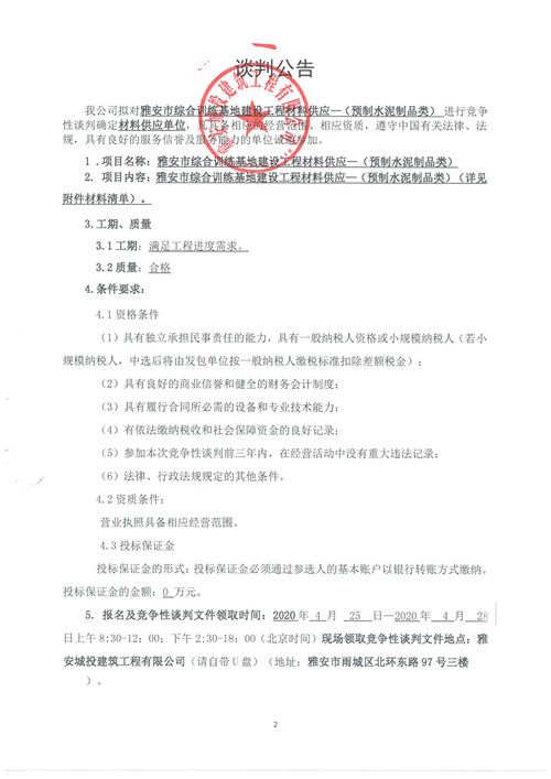 城投建工雅安市綜合訓(xùn)練基地建設(shè)工程材料供應(yīng)—(預(yù)制水泥制品類)競(jìng)爭(zhēng)性談判公告(第二次)