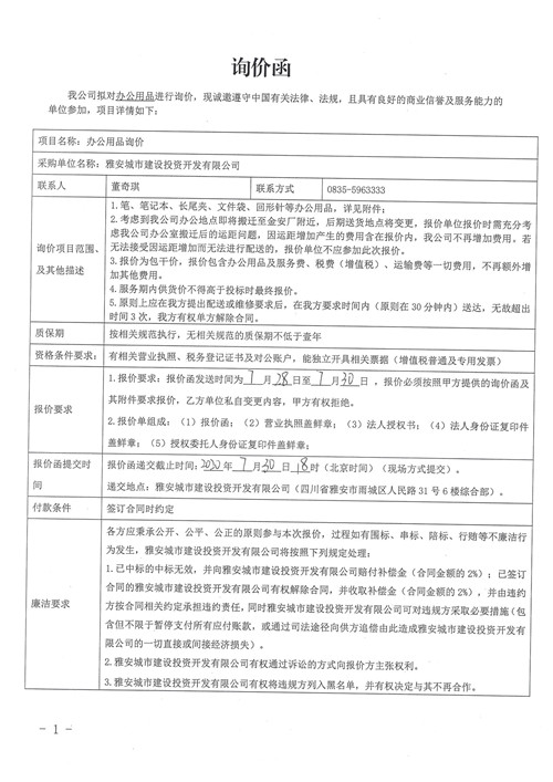 雅安城市建設(shè)投資開(kāi)發(fā)有限公司辦公用品詢(xún)價(jià)