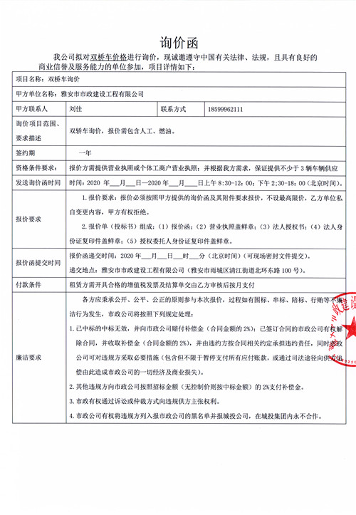 詢價(jià)函(黑豹車、農(nóng)用車、雙橋車租賃)