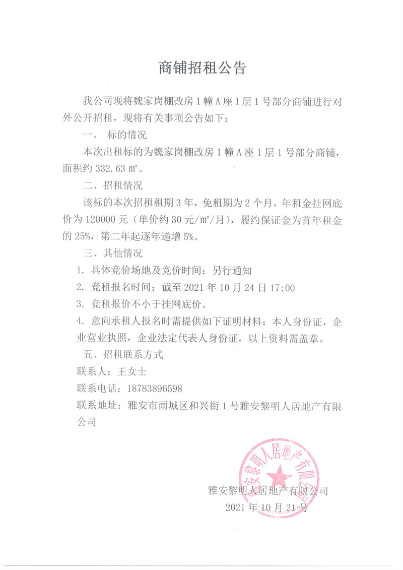 魏家崗安置房1幢A座1層1號(hào)部分商鋪招租公告