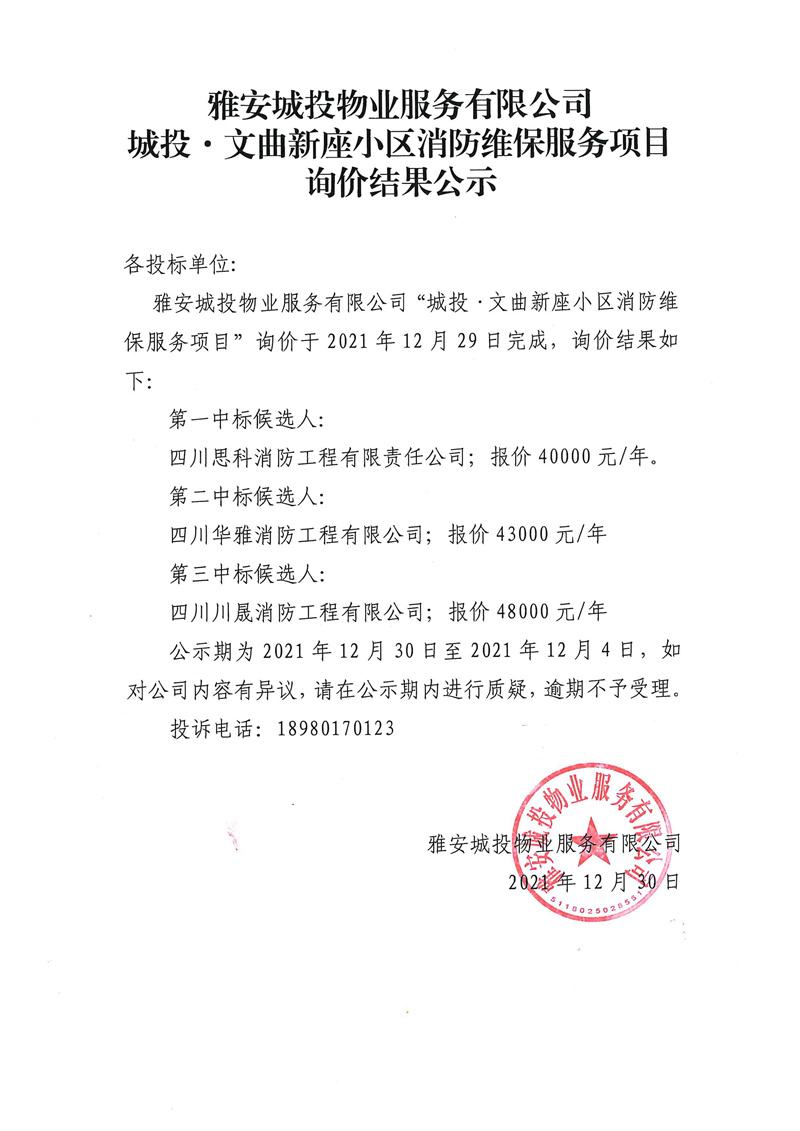 城投·文曲新座小區(qū)消防維保服務(wù)項目詢價結(jié)果公示