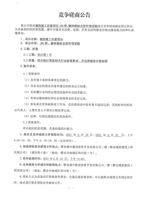 城投建工公司在建項(xiàng)目JDG管、鍍鋅鋼材及管件等采購(gòu)競(jìng)爭(zhēng)性磋商公告