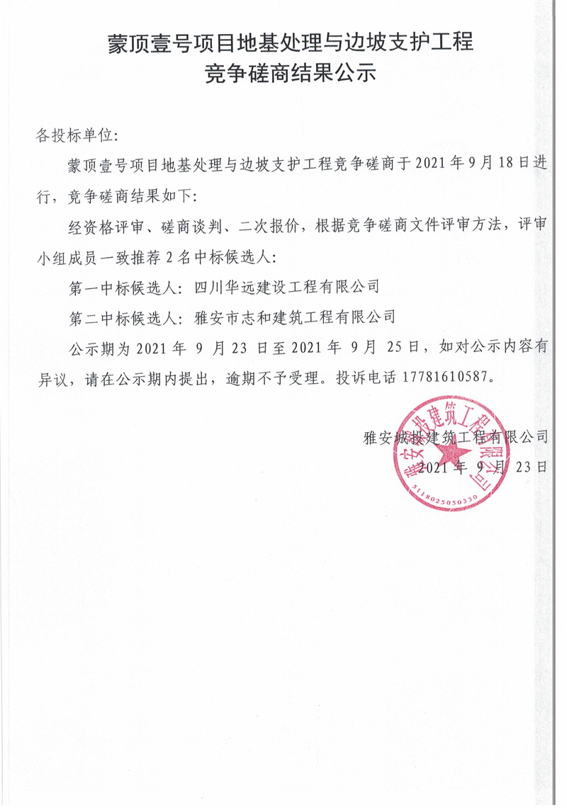 蒙頂壹號(hào)基礎(chǔ)抗浮錨桿及基坑支護(hù)工程競爭磋商結(jié)果公示