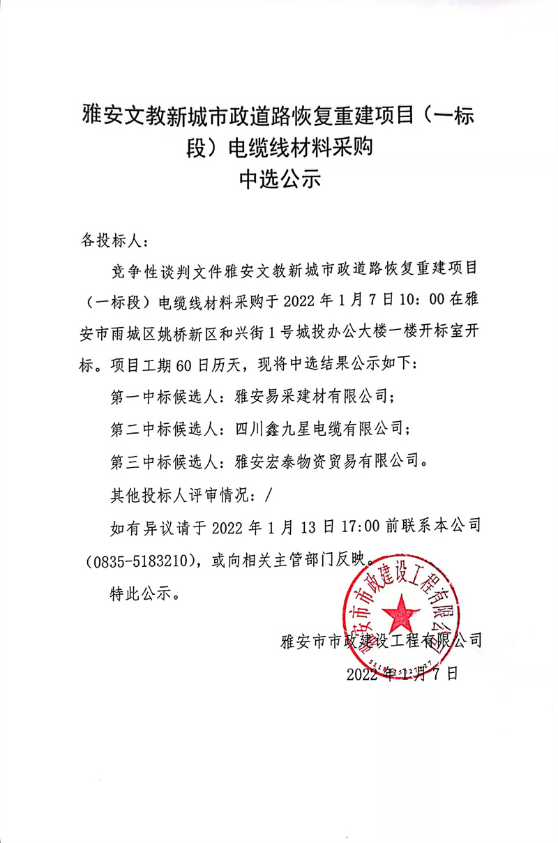 雅安文教新城市政道路恢復(fù)重建項(xiàng)目(一標(biāo)段)電纜線材料采購(gòu)中選公示