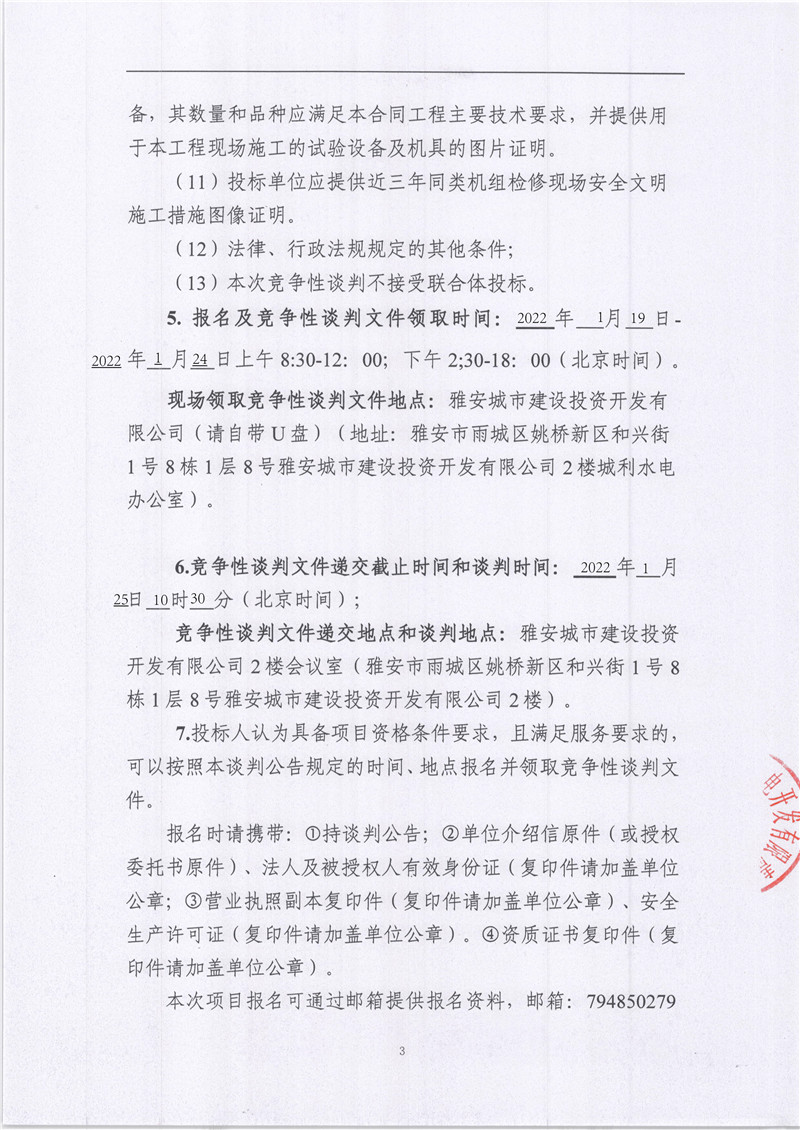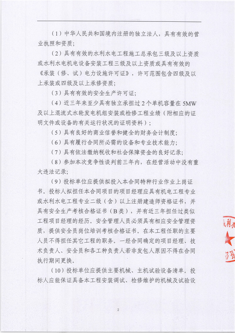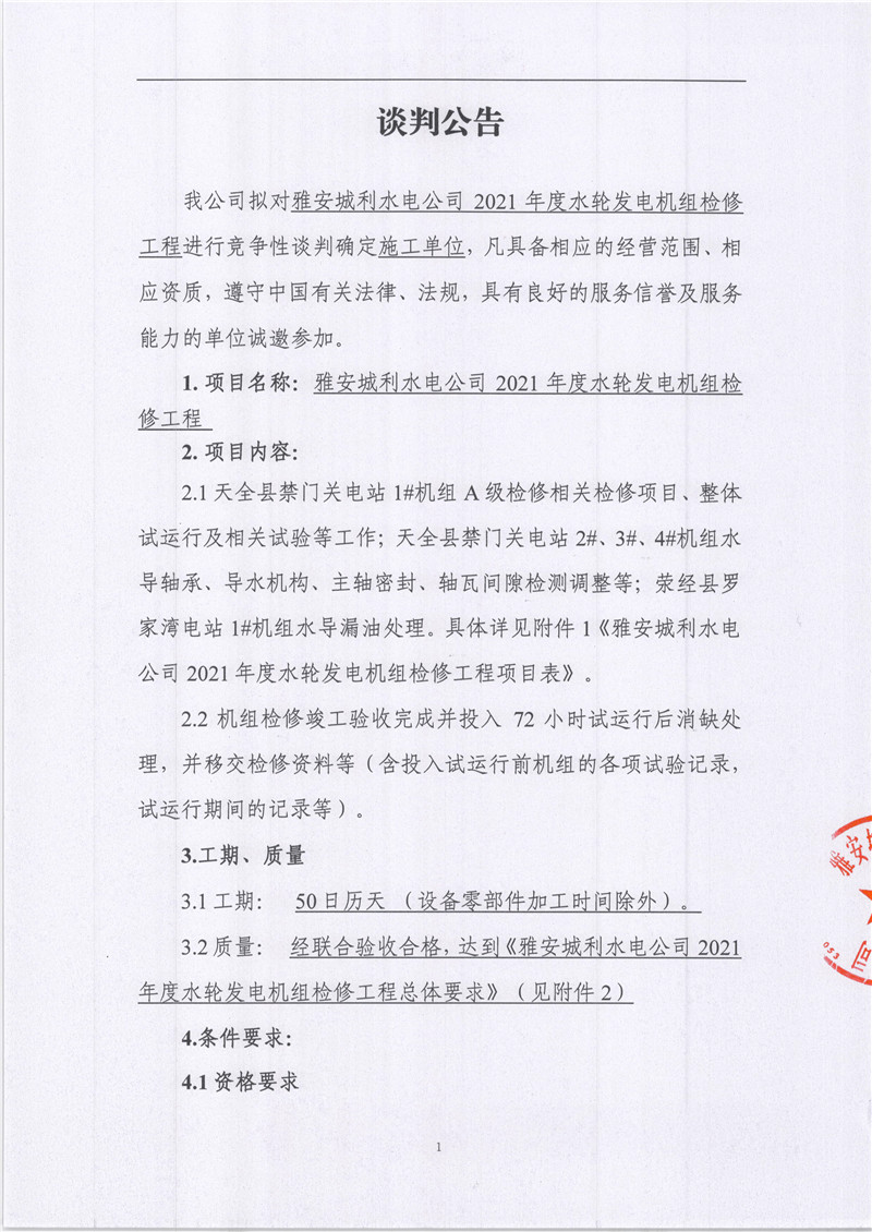 雅安城利水電公司2021年度水輪發(fā)電機(jī)檢修工程競爭性談判公告