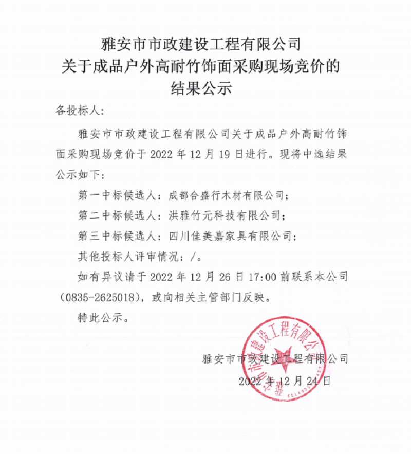 雅安市市政建設(shè)工程有限公司關(guān)于成品戶外高耐竹飾面采購現(xiàn)場競價結(jié)果公示