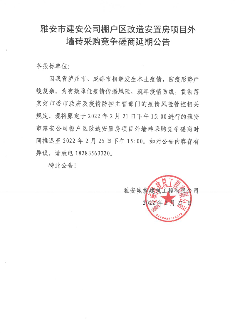 雅安市建安公司棚戶區(qū)改造安置房項(xiàng)目外墻磚采購競爭磋商延期公告