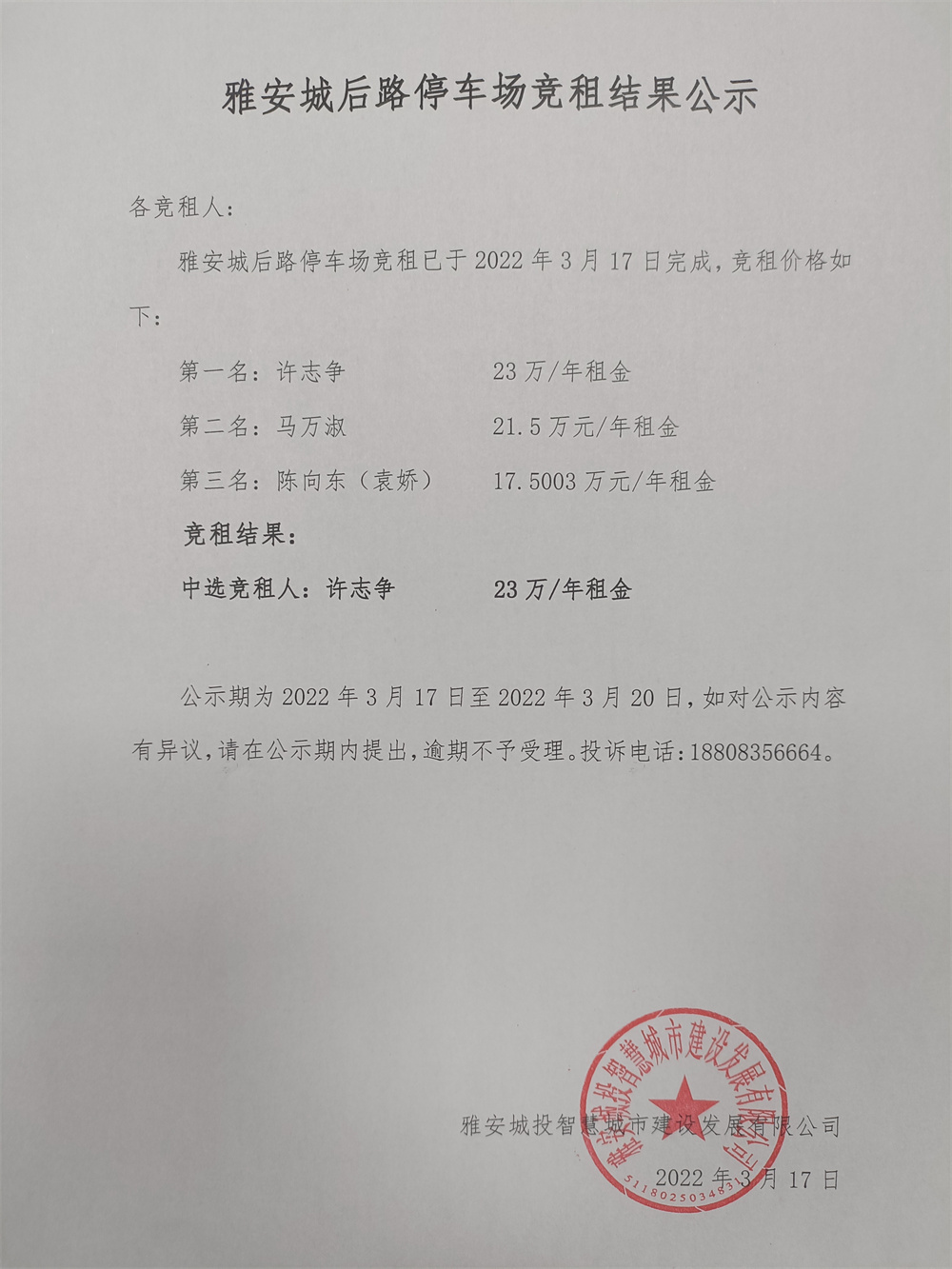 雅安城后路停車場(chǎng)競(jìng)租結(jié)果公示