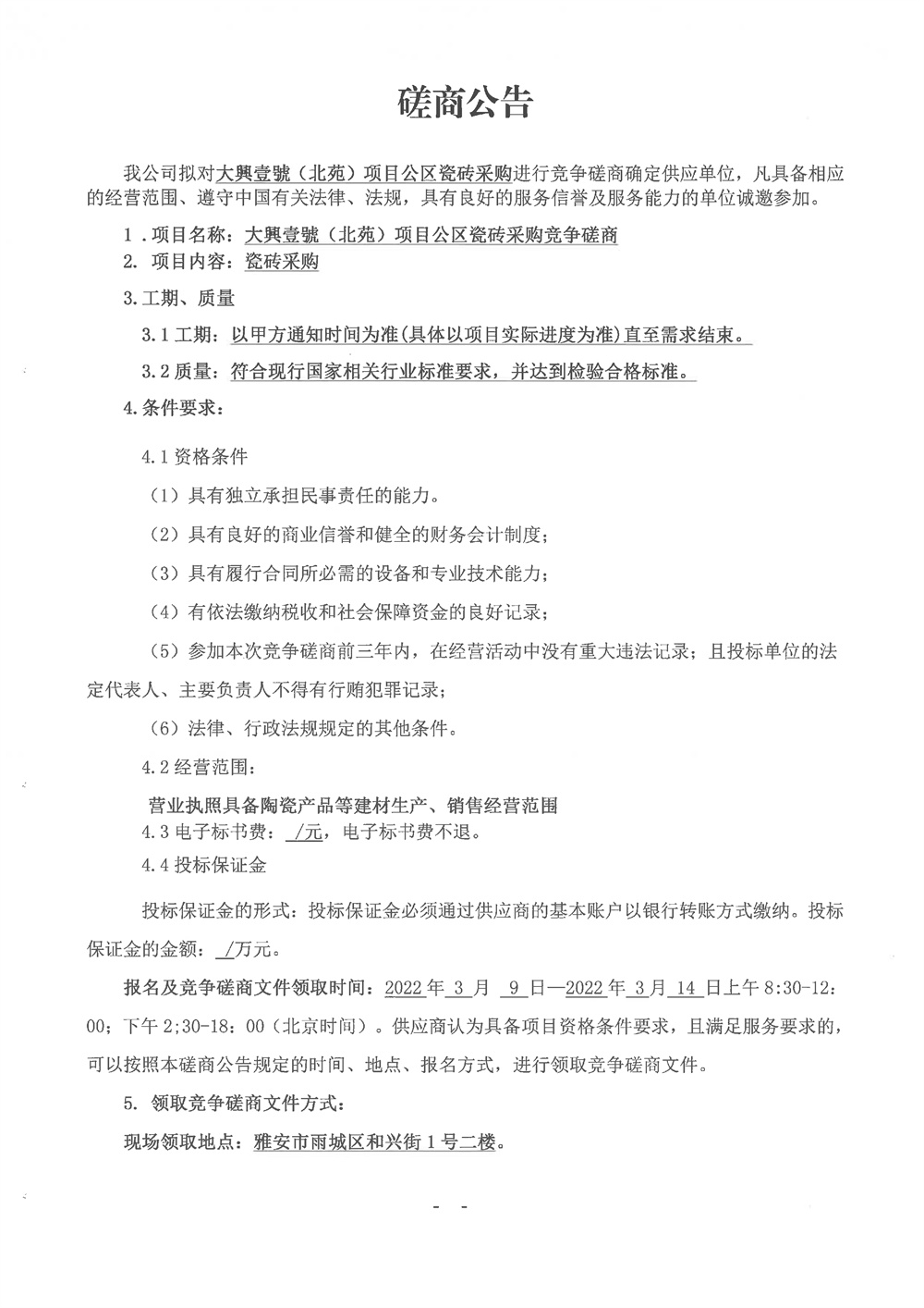 城投建工公司大興壹號(hào)(北苑)項(xiàng)目公區(qū)瓷磚采購競爭磋商公告
