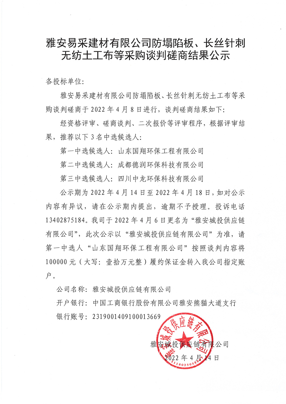 雅安易采建材有限公司防塌陷排水板、長絲針刺無紡?fù)凉げ嫉炔少徴勁写枭探Y(jié)果公示