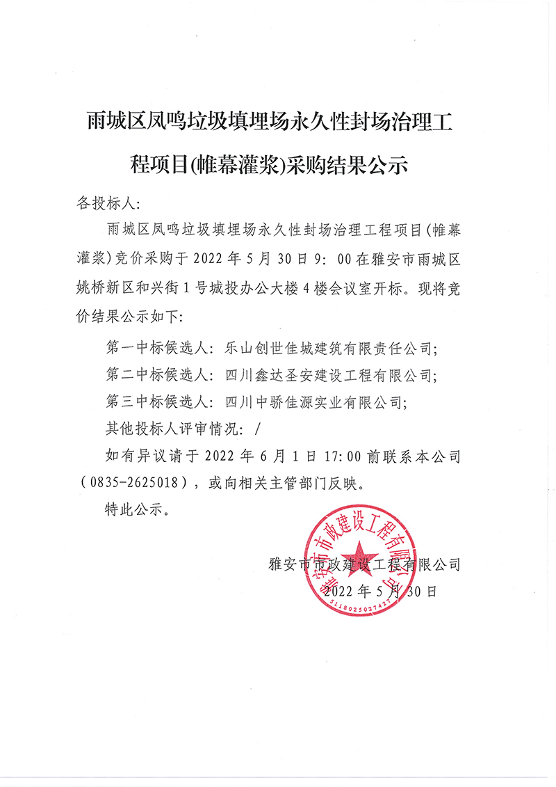 雨城區(qū)鳳鳴垃圾填埋場永久性封場治理工程項目(帷幕灌漿)采購結果公示