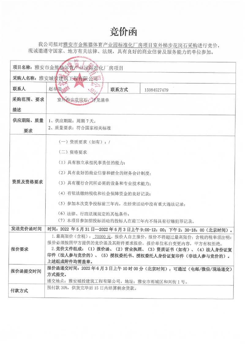 雅安市金熊貓?bào)w育產(chǎn)業(yè)園標(biāo)準(zhǔn)化廠房項(xiàng)目室外梯步花崗石采購競價(jià)函