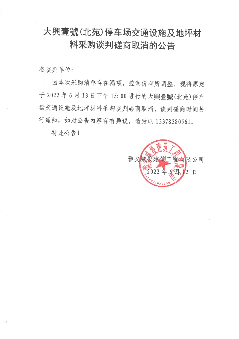 大興壹號(北苑)停車場交通設施及地坪材料采購談判磋商取消的公告