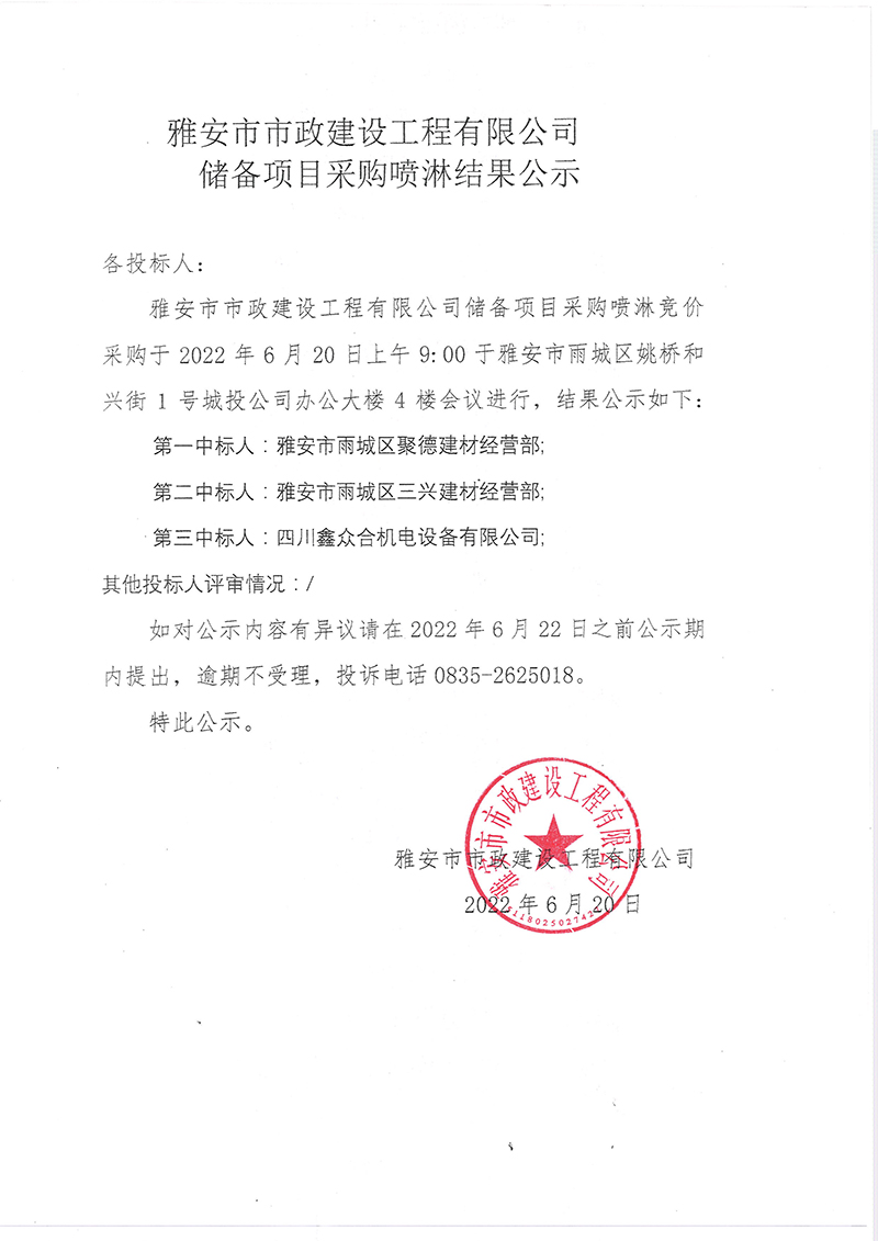 雅安市市政建設(shè)工程有限公司儲(chǔ)備項(xiàng)目噴淋系統(tǒng)結(jié)果公示