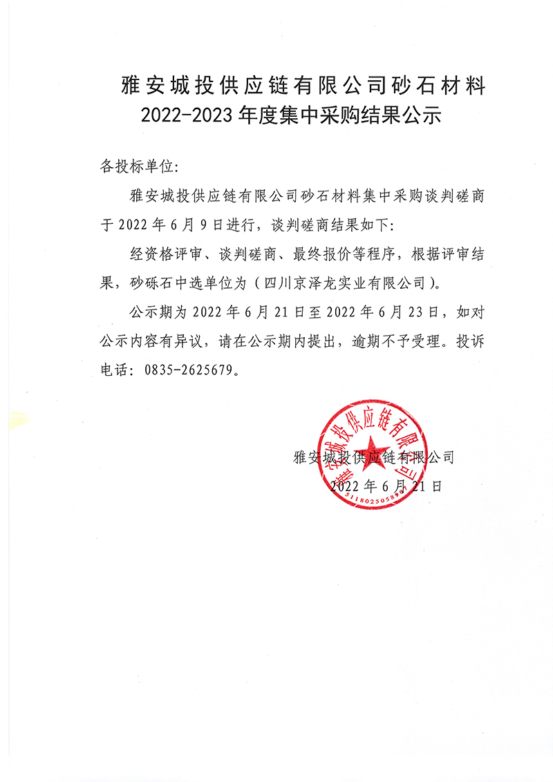 雅安城投供應(yīng)鏈有限公司砂石材料2022-2023年度集中采購(gòu)結(jié)果公示