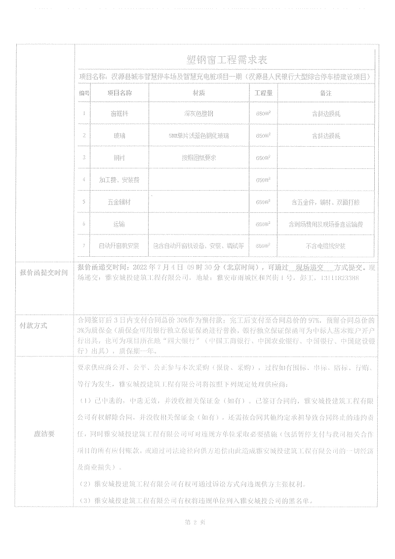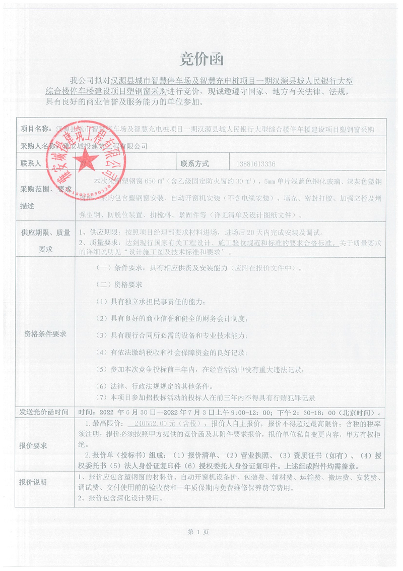 漢源縣城市智慧停車(chē)場(chǎng)及智慧充電樁項(xiàng)目一期漢源縣城人民銀行大型綜合樓停車(chē)樓建設(shè)項(xiàng)目塑鋼窗采購(gòu)競(jìng)價(jià)公告