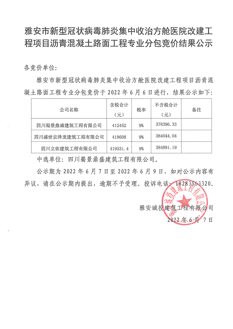 雅安市新型冠狀病毒肺炎集中收治方艙醫(yī)院改建工程項目瀝青混凝土路面工程專業(yè)分包競價結果公示