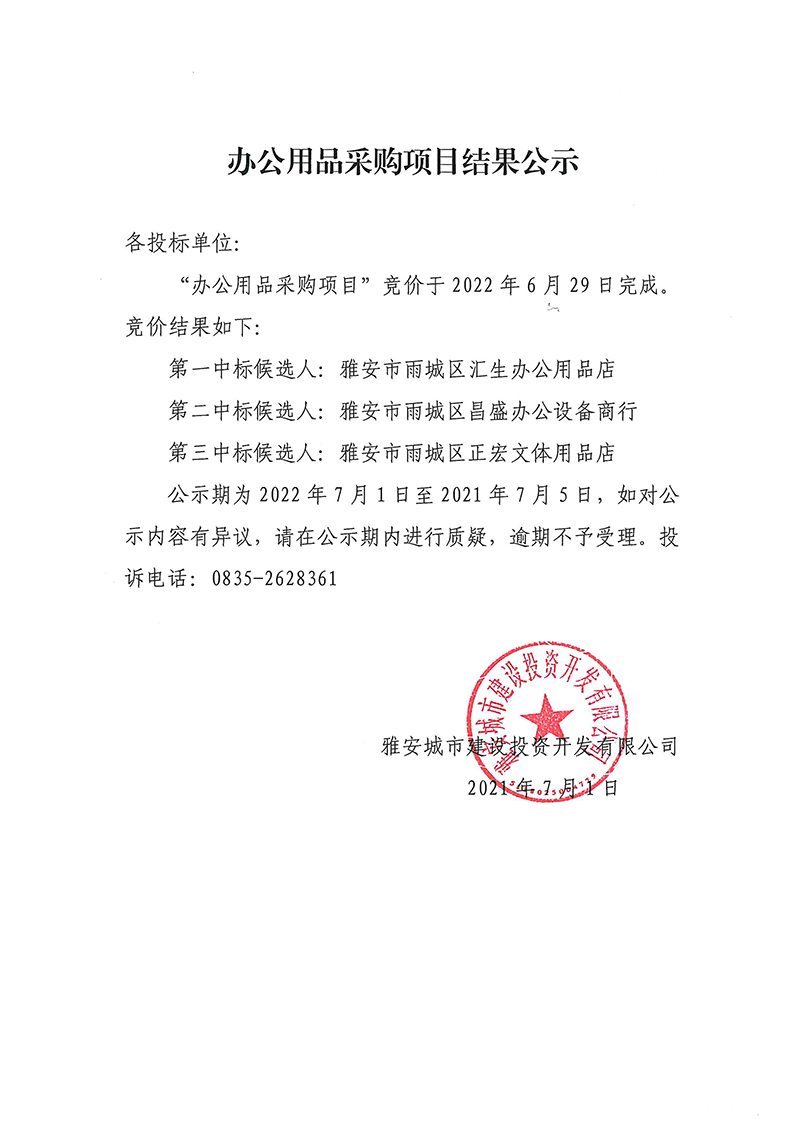 雅安城市建設(shè)投資開發(fā)有限公司辦公用品采購(gòu)項(xiàng)目競(jìng)價(jià)結(jié)果公示