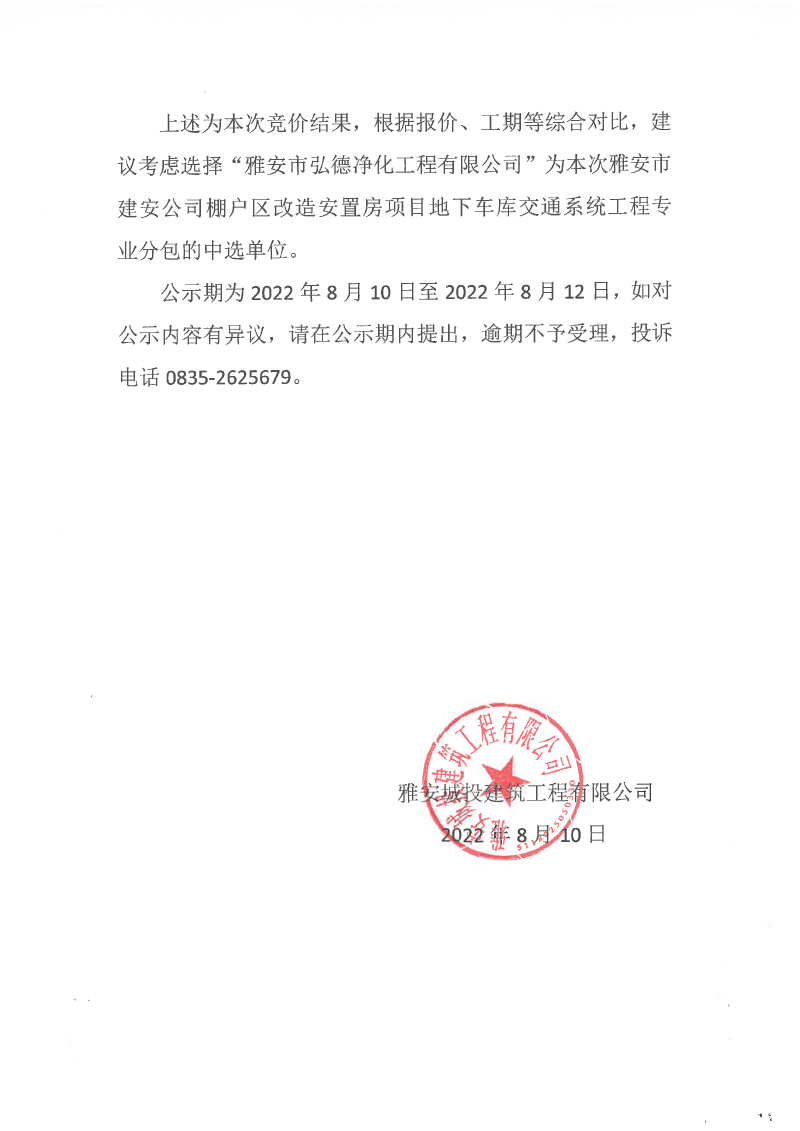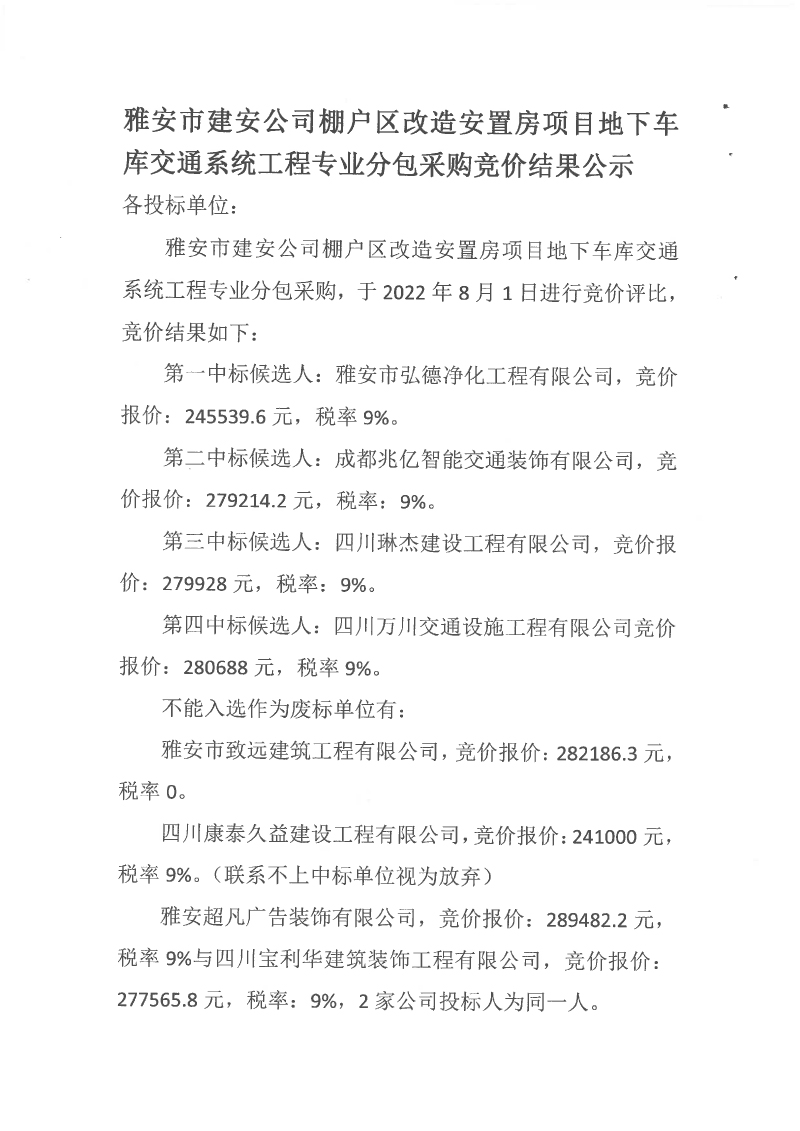 雅安市建安公司棚戶(hù)區(qū)改造安置房項(xiàng)目地下車(chē)庫(kù)交通系統(tǒng)工程專(zhuān)業(yè)分包競(jìng)價(jià)結(jié)果公示