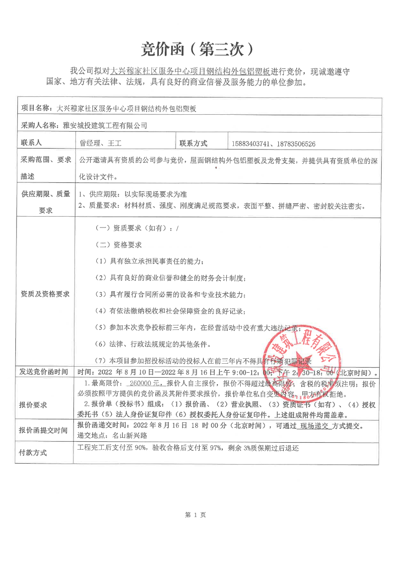 大興穆家社區(qū)服務中心項目鋼結構外包鋁塑板競價公告(第三次)
