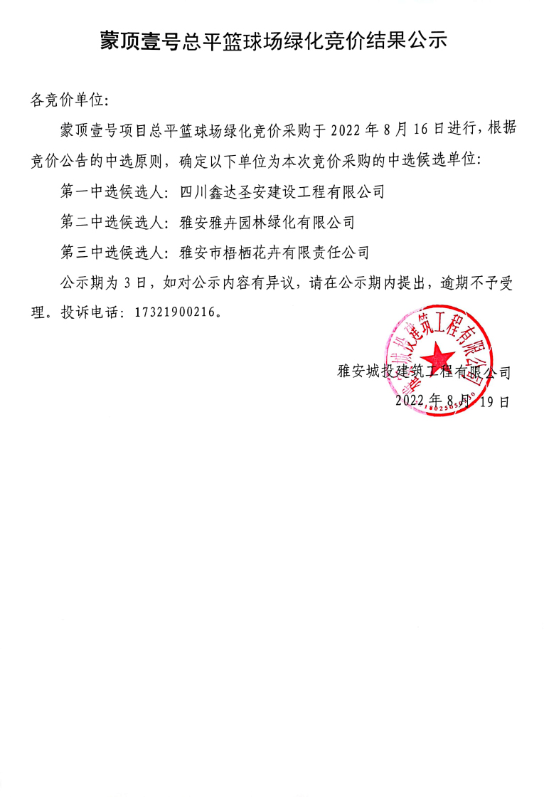 蒙頂壹號項目總平籃球場綠化競價結果公示