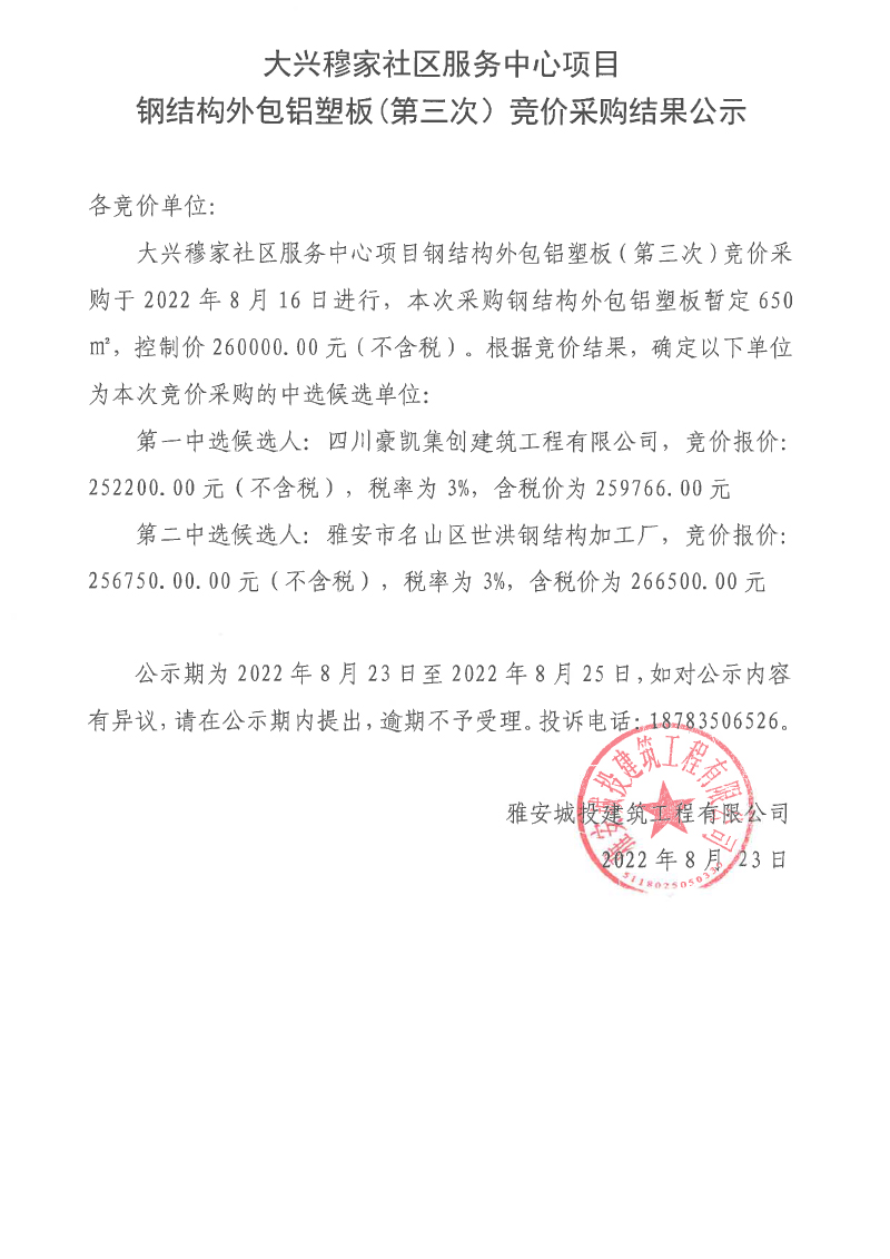 大興穆家社區(qū)服務(wù)中心項(xiàng)目鋼結(jié)構(gòu)外包鋁塑板(第三次)競(jìng)價(jià)采購(gòu)結(jié)果公示