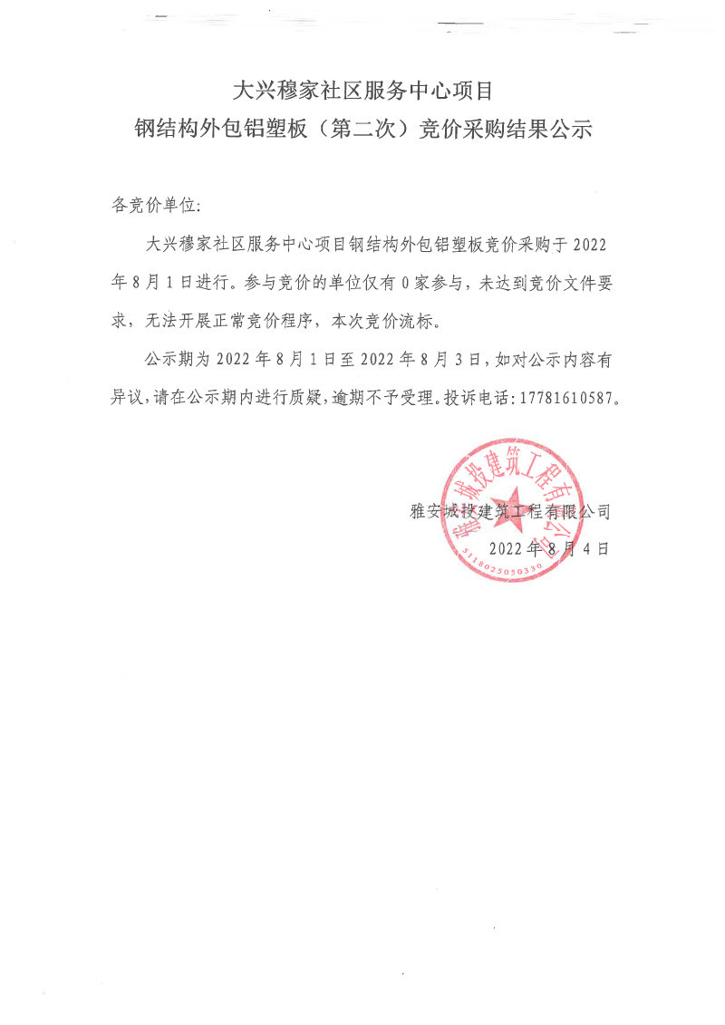 大興穆家社區(qū)服務(wù)中心項目鋼結(jié)構(gòu)外包鋁塑板(第二次)競價采購結(jié)果公示