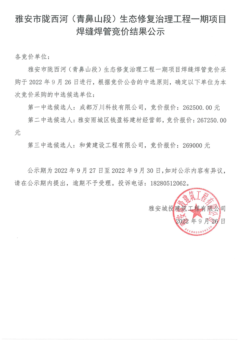 雅安市隴西河(青鼻山段)生態(tài)修復治理工程一期項目焊縫焊管采購競價結果公示
