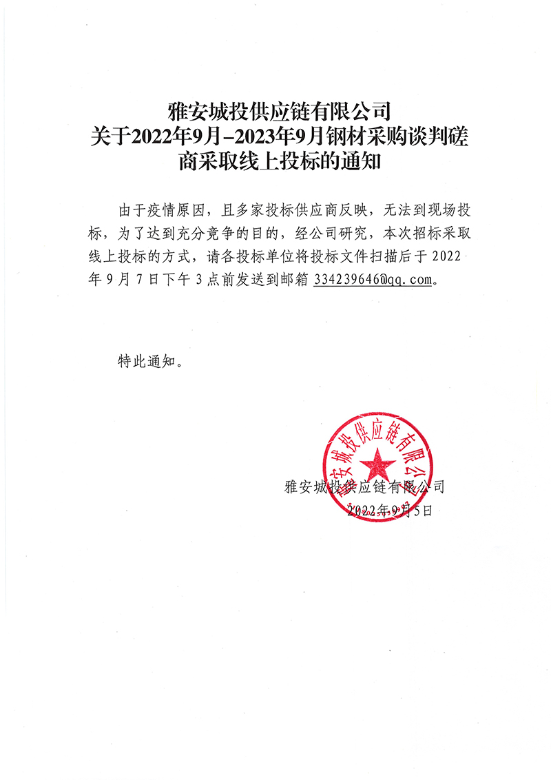 雅安城投供應(yīng)鏈有限公司關(guān)于2022年9月-2023年9月鋼材采購(gòu)談判磋商采取線上投標(biāo)的通知