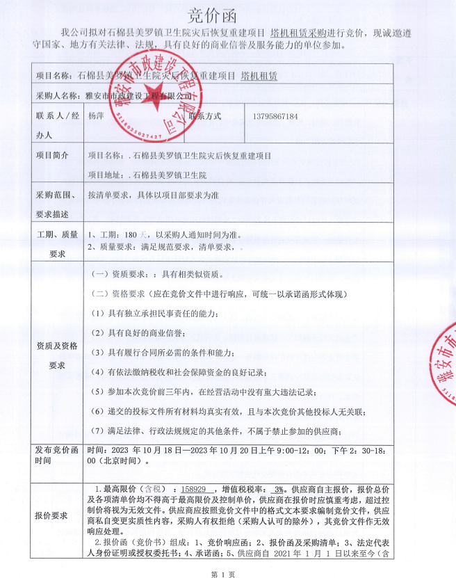 石棉縣美羅鎮(zhèn)衛(wèi)生院災(zāi)后恢復(fù)重建項(xiàng)目塔機(jī)租賃采購(gòu)競(jìng)價(jià)公告