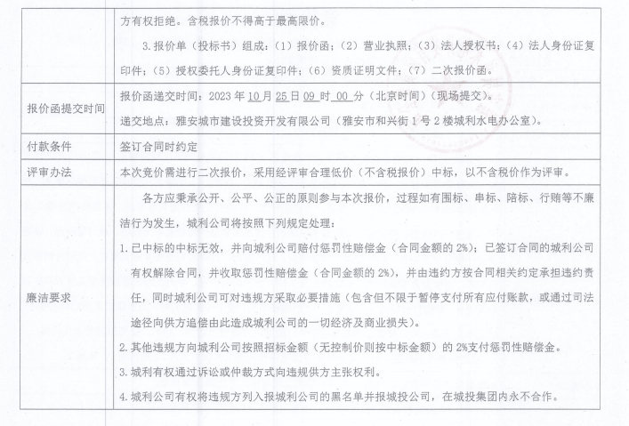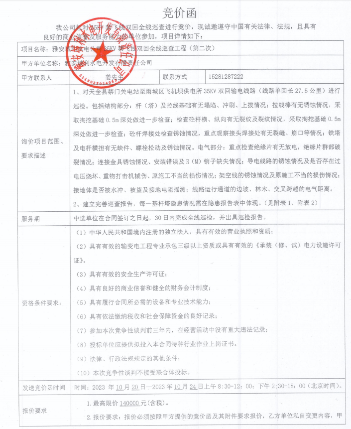 雅安城利水電公司35KV禁飛線雙回全線巡查工程(第二次)競價(jià)公告