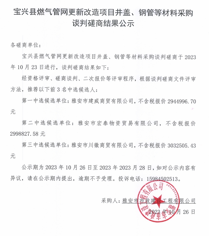 寶興縣燃?xì)夤芫W(wǎng)更新改造項(xiàng)目井蓋、鋼管等材料采購談判磋商結(jié)果公示