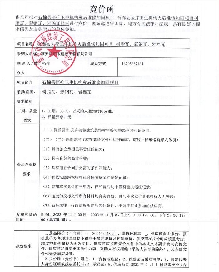 石棉縣醫(yī)療衛(wèi)生機(jī)構(gòu)災(zāi)后維修加固改造項(xiàng)目采購(gòu)樹(shù)脂瓦、彩鋼瓦、巖棉瓦材料競(jìng)價(jià)公告