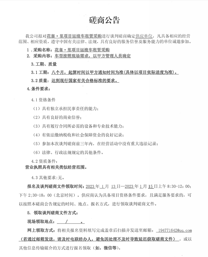 花襄·里項目運渣車租賃采購談判磋商公告