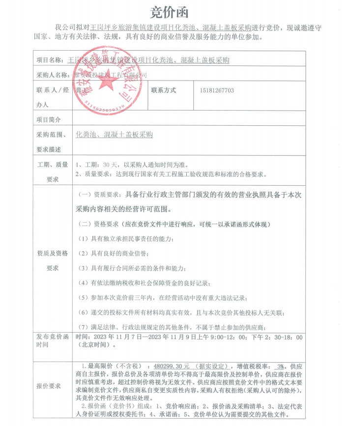 王崗坪鄉(xiāng)旅游集鎮(zhèn)建設項目化糞池、混凝土蓋板采購競價公告