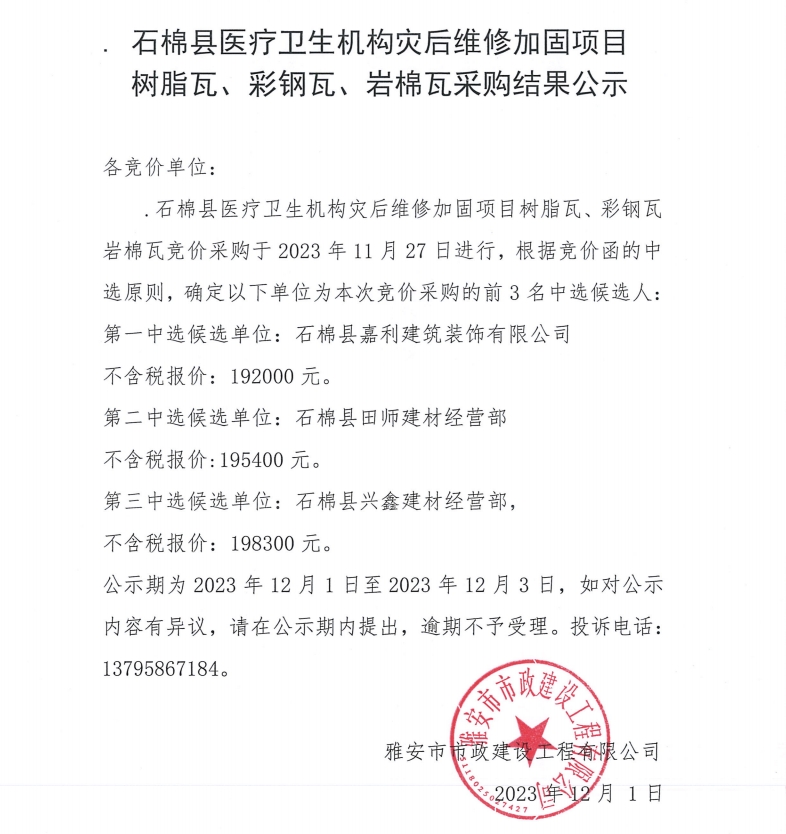 石棉縣醫(yī)療衛(wèi)生機構(gòu)災(zāi)后維修加固項目樹脂瓦、彩鋼瓦、巖棉瓦采購結(jié)果公示