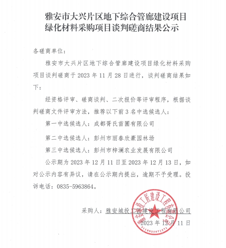 雅安市大興片區(qū)地下綜合管廊建設項目綠化材料采購項目談判磋商結(jié)果公示