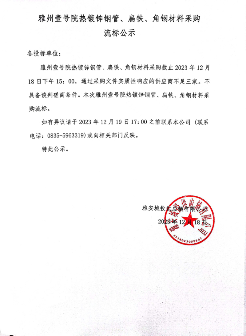 雅州壹號(hào)院熱鍍鋅鋼管、扁鐵、角鋼材料采購流標(biāo)公示