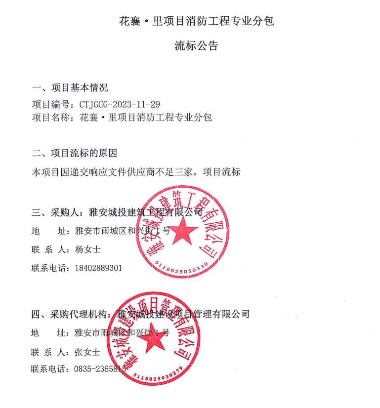 花襄·里項目消防工程專業(yè)分包流標公告