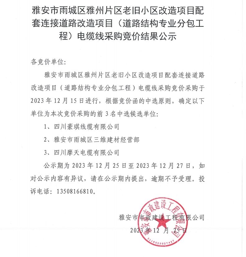 雅安市雨城區(qū)雅州片區(qū)老舊小區(qū)改造項(xiàng)目配套連接道路改造項(xiàng)目(道路結(jié)構(gòu)專業(yè)分包工程)電纜線采購競價結(jié)果公示