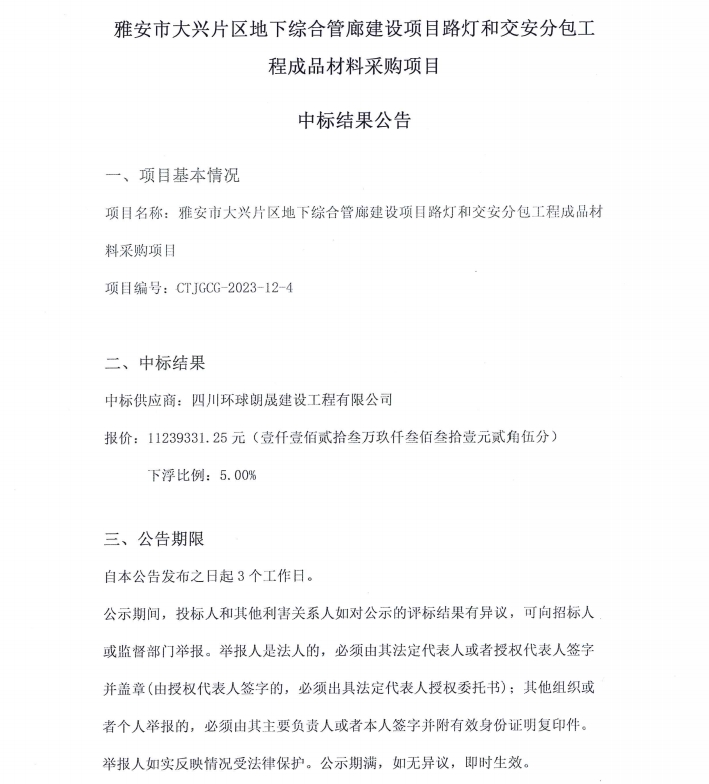 雅安市大興片區(qū)地下綜合管廊建設項目路燈和交安分包工程成品材料采購項目中標結果公告