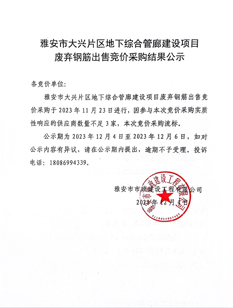 雅安市大興片區(qū)地下綜合管廊建設(shè)項目廢棄鋼筋出售競價采購結(jié)果公示